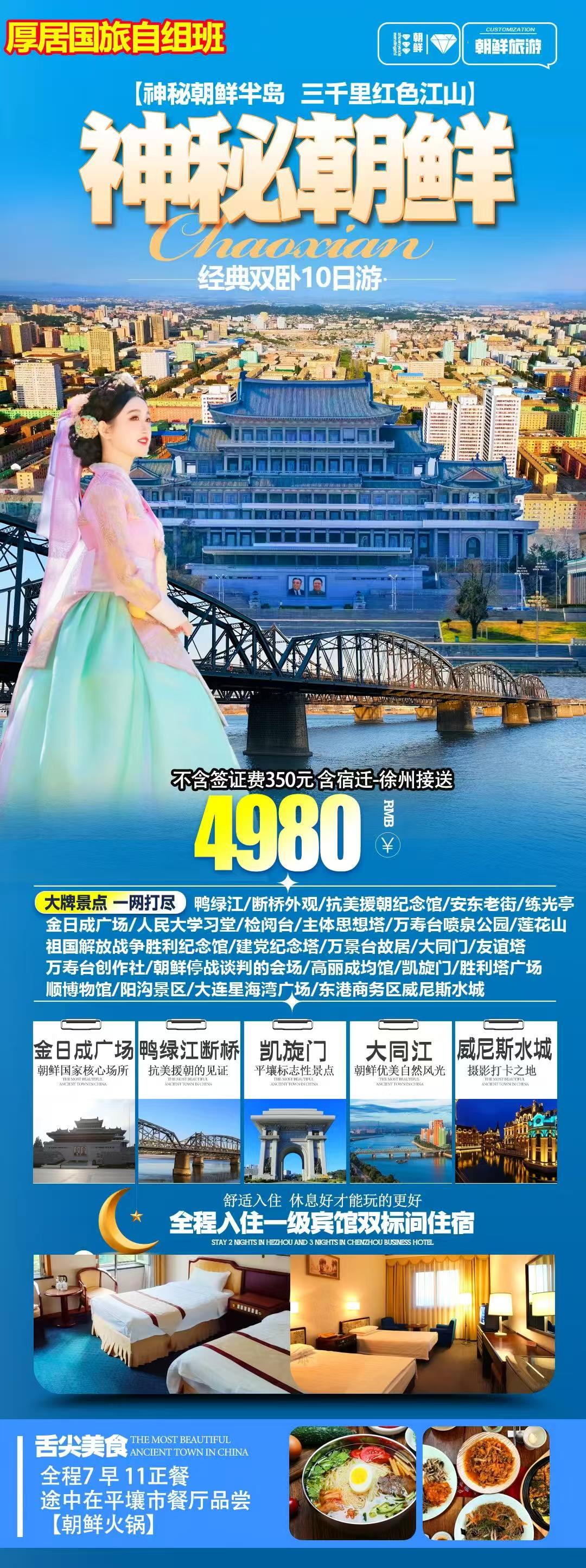 二:报价不含: 1.护照工本费、境外意外伤害险及一切个人消费。 2 .单房差: 报价为2 人1 间房,如果1个人入住一间房需与其他客人拼住或补房差。 3.因交通延误或政治原因等一切不可抗拒因素导致行程变更所引致的额外费用(按旅游法执行) 4.旅游费用不包括旅游者因违约、自身过错、自 由活动或自身疾病引起的人身和财产损失 5. 不含司机小费20元/人/天 请在出团前交清。 三:退团须知: 出团前5天退团者,收取80%团款;出团前3天退团者团费不退 特别提示: 1 .在朝鲜旅游期间牢记导游领队的安全告知 ,若在此期间因个人不恰当行为(不尊重朝鲜法律 、擅自离队等) 所导致发生的财产与人身安全事故均由 自己承担。 2.由于朝鲜国家政治因素 ,如遇朝鲜线路取消,或者景区不能参观 ,我社协调取消行程或者改线事宜,不接受投诉,望理解 3 .有心脏病、严重血管疾病 、哮喘病 、易突发性疾病及传染病、法定传染病、精神病、孕妇等不宜出门者谢绝报名。如有隐瞒 ,后果自负!65 岁以上的老人需要提供身体健康证明及家属陪同 ,75 岁 以上(包含75岁 ) 的老人不建议报名 。行程中如有妙香山妙香山国际友谊展览馆11岁以下儿童不允许进馆参观。 在景点不变的情况下 ,根据当时交通 、天气、景点景区接待条件等 ,顺序做出适当调整。 |